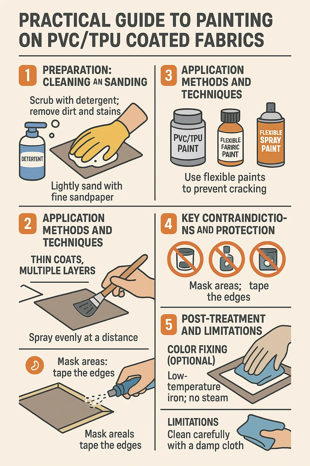 Tu je praktický návod na maľovanie na Tkaniny potiahnuté PVC a tkaniny potiahnuté TPU, zahŕňajúce bežné prevádzkové skúsenosti a bezpečnostné opatrenia: