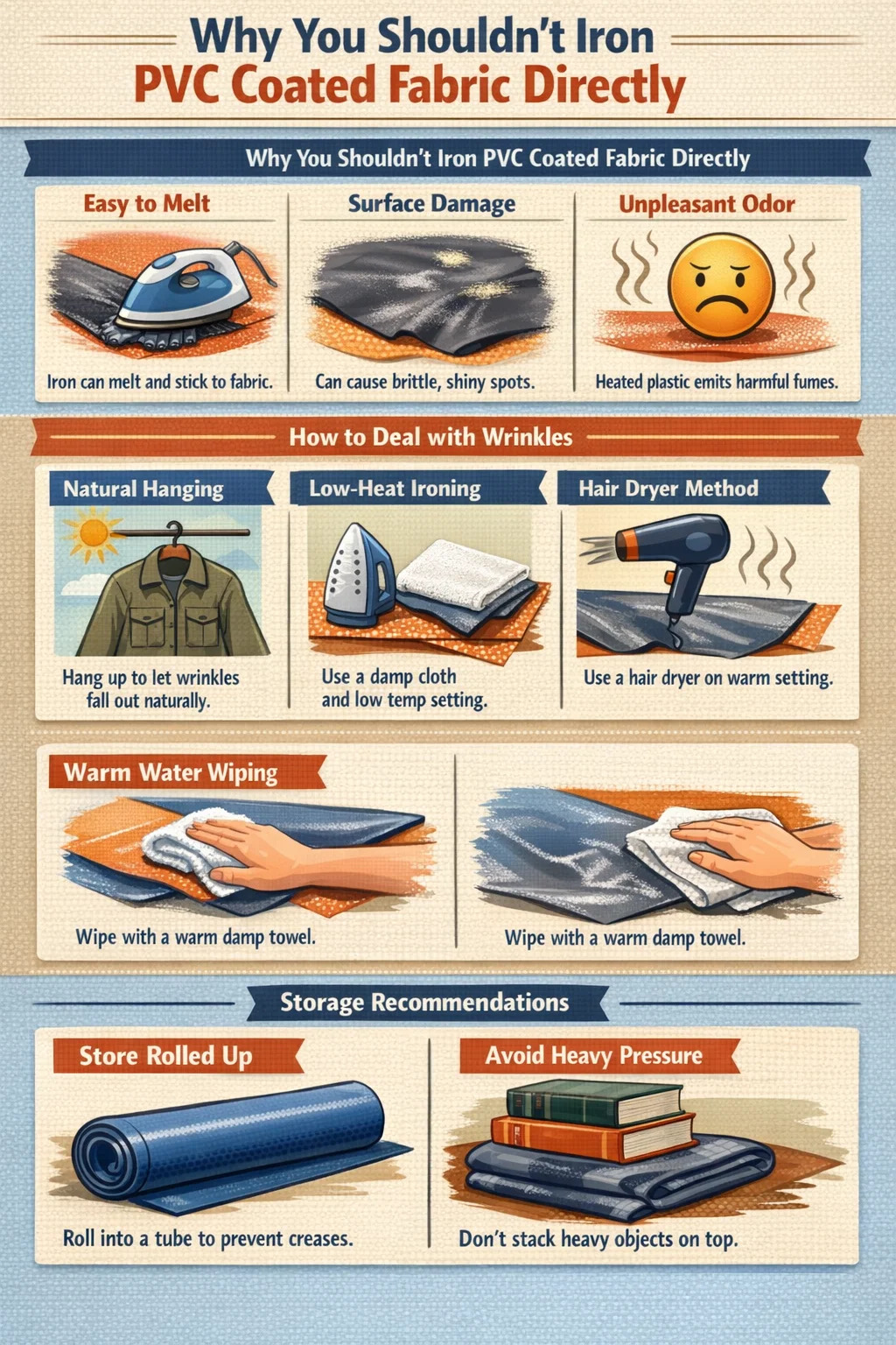 Nízkoteplotné žehlenie s látkovou bariérou: Ak musíte použiť žehličku, nastavte ju na najnižšiu teplotu. Na zadnú stranu látky potiahnutej PVC (stranu bez poťahu) položte hrubú, vlhkú bavlnenú látku ako nárazník. Nikdy nedovoľte, aby sa žehlička priamo dotýkala látky a udržiavajte ju v neustálom pohybe; nikdy ho nenechávajte na jednom mieste.