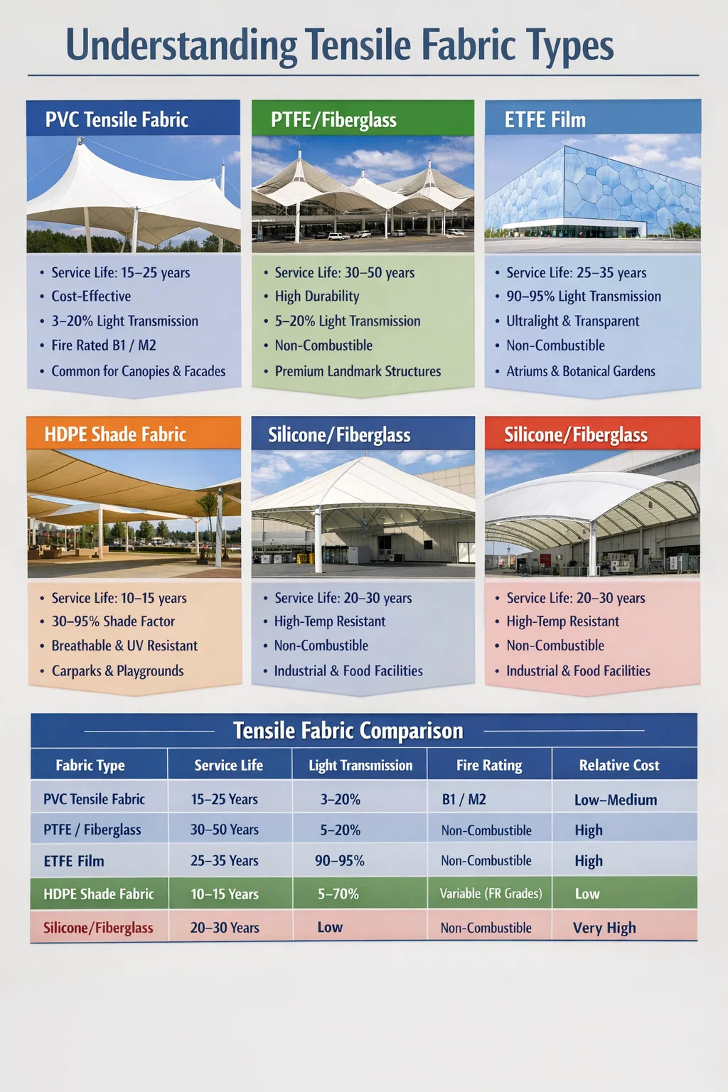 Ťahová tkanina sa dodáva v niekoľkých odlišných typoch, z ktorých každý je navrhnutý pre špecifické požiadavky na výkon. Hlavné kategórie sú PVC ťažná tkanina, PTFE (polytetrafluóretylén) tkanina, ETFE (etyléntetrafluoroetylénová) fólia, HDPE tienidlo a silikónom potiahnuté sklolaminát . Medzi nimi dominuje na globálnom trhu PVC ťahová tkanina – čo predstavuje zhruba 60 – 70 % všetkých architektonických membránových inštalácií – vďaka svojej nákladovej efektívnosti, širokému rozsahu farieb a spoľahlivým konštrukčným vlastnostiam v rôznych klimatických podmienkach. Pochopenie každého typu je nevyhnutné predtým, ako sa pustíte do akéhokoľvek projektu ťahovej konštrukcie, či už ide o baldachýn, strechu štadióna alebo membránovú fasádu s dlhým rozpätím.