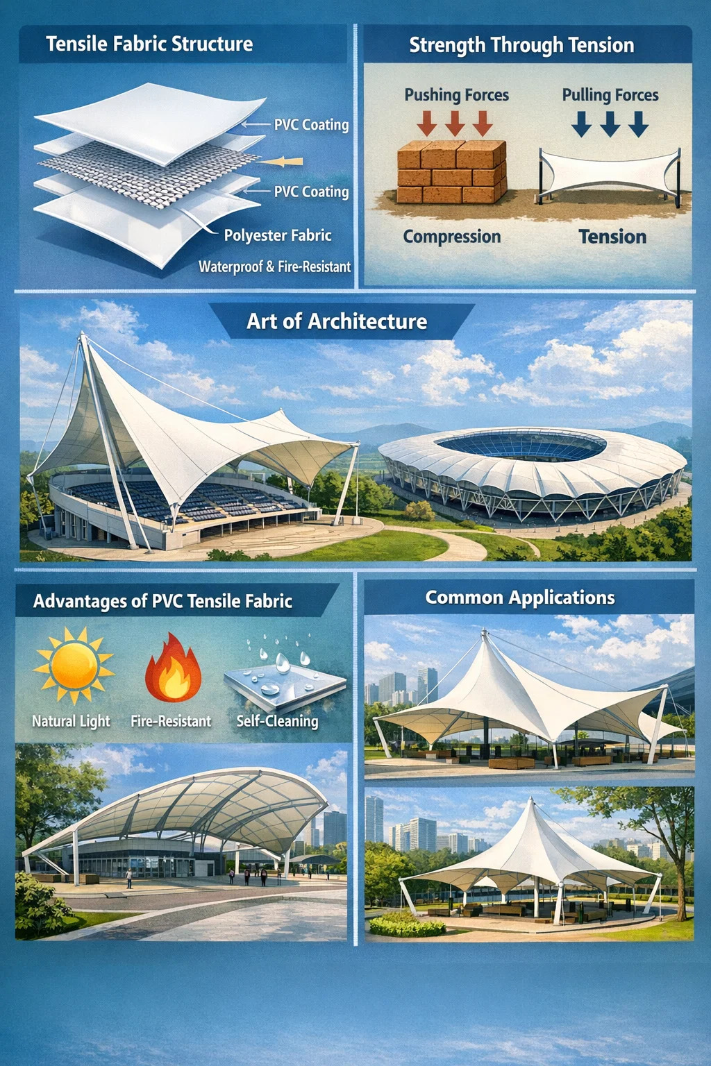 Ľahký a priehľadný: Dokáže pokryť extrémne veľké plochy (napríklad celú tribúnu štadióna), ale nevyžaduje husté stĺpy pod ním, čím poskytuje vynikajúci priestorový pocit.