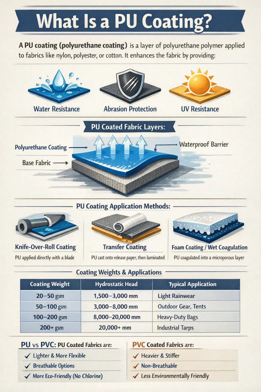 PU povlak - skratka pre polyuretánový povlak - je vrstva polyuretánového polyméru, ktorá sa aplikuje priamo na základnú tkaninu, ako je nylon, polyester alebo bavlna, aby sa zlepšili jej výkonnostné vlastnosti. Náter sa chemicky a mechanicky viaže na textilný povrch a vytvára súvislý pružný film, ktorý odoláva prenikaniu vody, oderu a v mnohých formuláciách aj degradácii ultrafialovým žiarením.