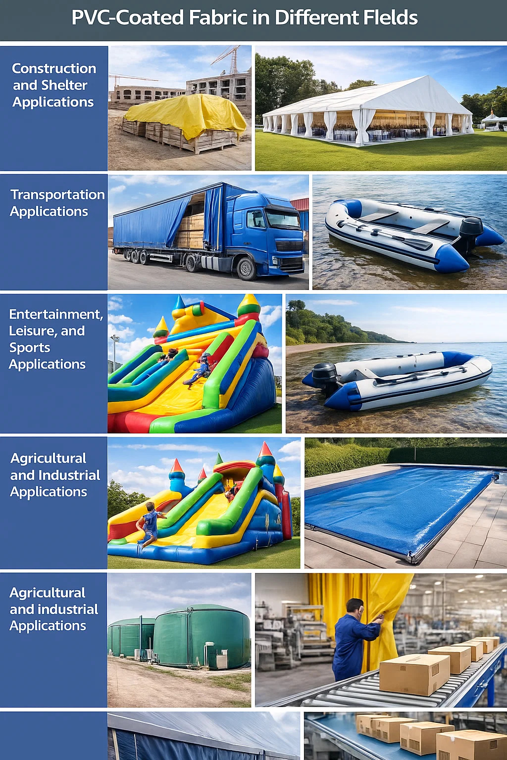 Tu sú niektoré z hlavných použití tkaniny potiahnutej PVC v rôznych oblastiach: