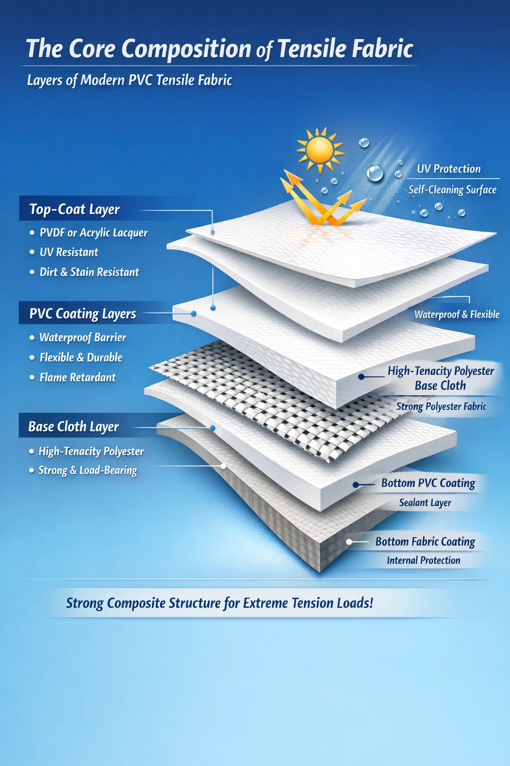 Najmodernejšie PVC ťažná tkanina je sofistikovaný kompozitný materiál pozostávajúci z troch základných vrstiev: a vysokopevnostná polyesterová základná tkanina , hustý Povlak z PVC (polyvinylchlorid). , a špecializovaný vrchný lak ako je PVDF alebo akryl. Vnútorná tkanina poskytuje štrukturálnu pevnosť na zvládnutie masívneho ťahového zaťaženia, zatiaľ čo vonkajšie plastové vrstvy chránia vlákna pred degradáciou životného prostredia, vodou a ohňom.