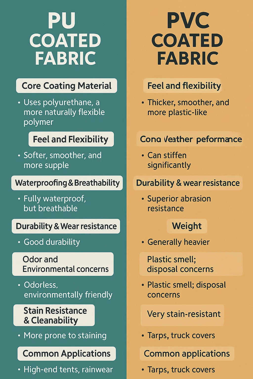 Tu je rozpis kľúčových rozdielov medzi tkaninou potiahnutou PU a Tkanina potiahnutá PVC na základe praktických charakteristík a aplikácií: