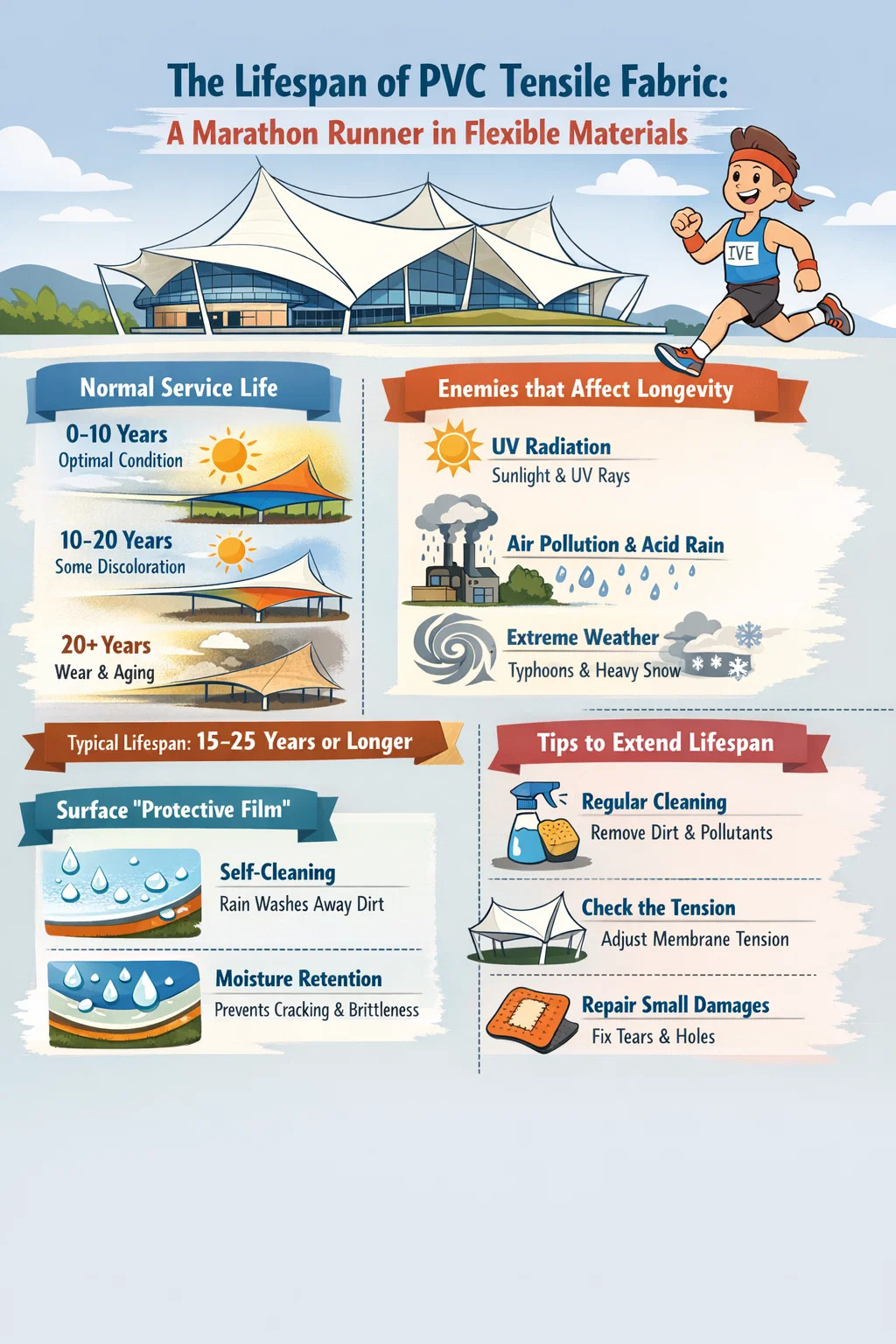Pri bežnej údržbe môžu vysokokvalitné PVC štruktúry ťahaných textílií zvyčajne vydržať 15 až 25 rokov alebo aj dlhšie.